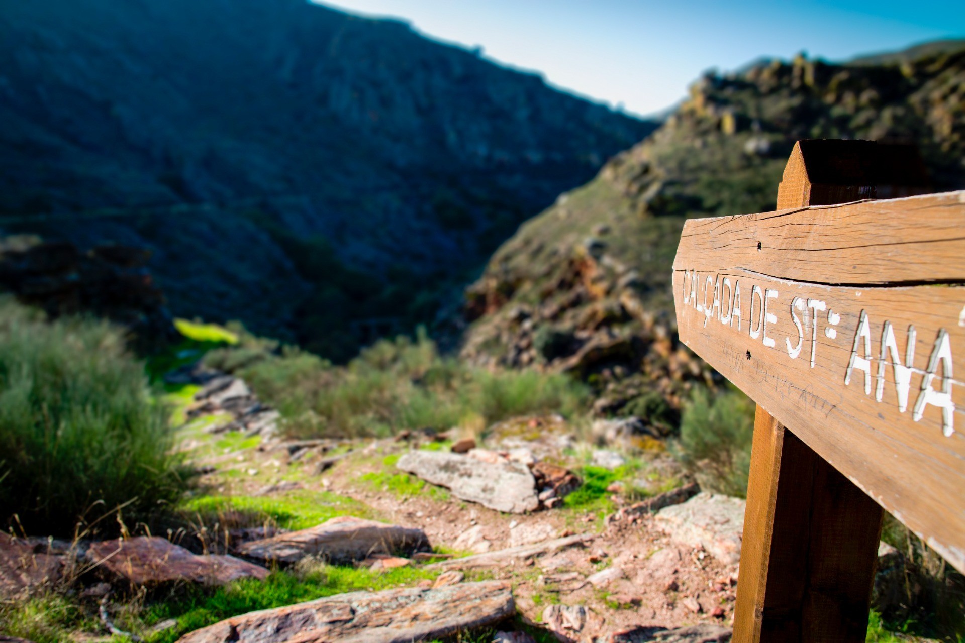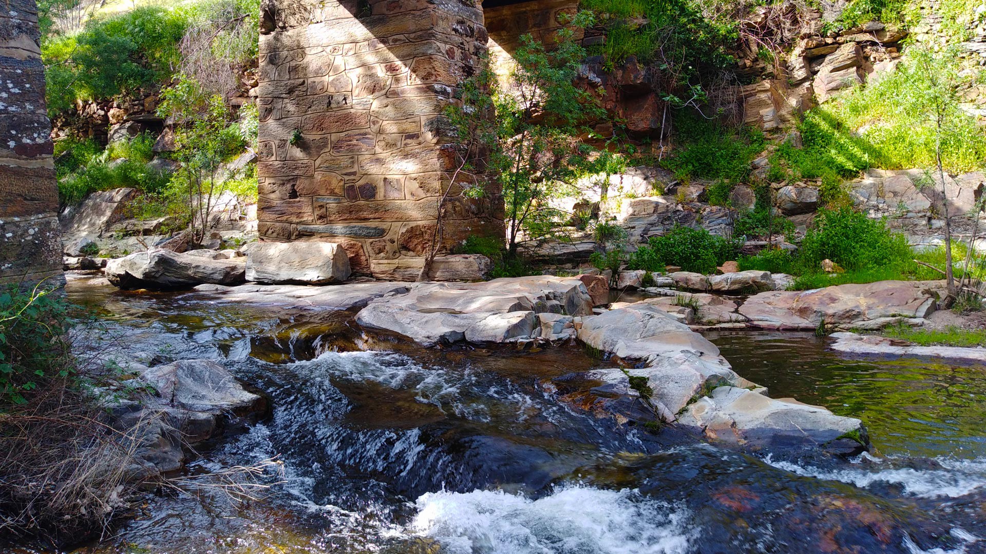 Calçada em xisto, inserida num cenário de cortar a respiração que termina na Ponte de Poiares sobre a Ribeira do Mosteiro.
